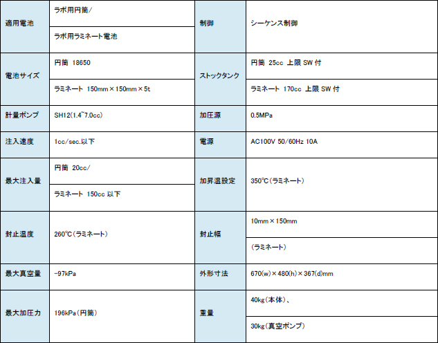 ラミネート電池の場合は注入終了後真空状態のままラミネートを加熱封止します。 - 設置場所はアルゴン雰囲気のグローブボックスやドライルームに対応しています。