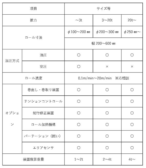 | オプション | 巻出・巻取り装置、ロール加熱方式、囲いカバーなど |